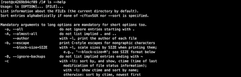 Using --help to show the documentation for ls command.